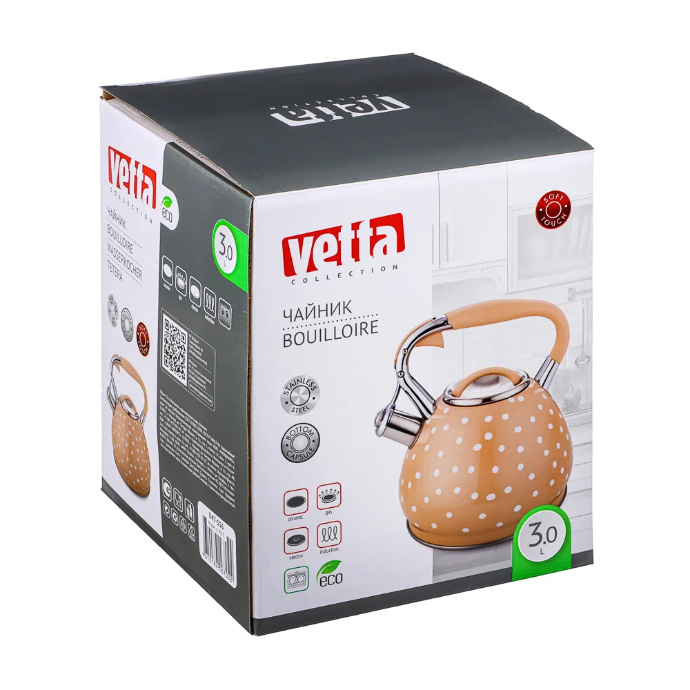 Чайник "Горошек-Леме" от VETTA объемом 3 л - отличный помощник на вашей кухне! Подходит для всех видов плит, включая индукционные. Это качественный и стильный чайник, который отлично подойдет для приготовления горячих напитков в домашних условиях. Чайник выполнен из нержавеющей стали, которая обеспечивает долговечность и надежность использования. Дизайн чайника очень эффектный, благодаря чему он станет ярким элементом интерьера кухни. Важно отметить, что чайник VETTA оснащен индукционным дном, что позволяет быстро и равномерно нагревать воду, а также экономить время и энергию. Это делает его идеальным выбором для тех, кто ценит комфорт и практичность в использовании кухонной утвари.