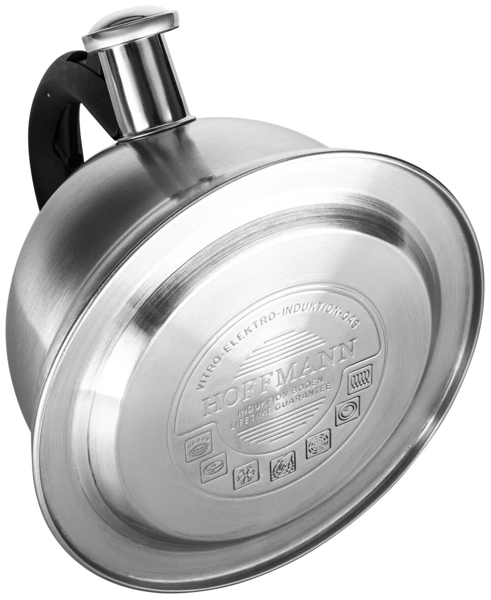 Чайник со свистком HOFFMANN НМ 55172, 3,0 л. Чайник изготовлен из прочной нержавеющей стали и оснащен ручкой, которая не нагревается во время использования. Прочные стенки толщиной 0,6 мм обеспечат долговечность, а стильное матовое покрытие позволит чайнику вписаться в любой кухонный интерьер. Компания Hoffmann – знаменитый производитель высококачественной кухонной посуды и различных кухонных аксессуаров. Компания уделяет очень большое внимание даже маленьким деталям при производстве своей продукции, считая, что посуда Hoffmann кроме функциональности и качества должна приносить радость своей красотой и изяществом, стать украшением для любой кухни. В процессе производства все материалы, используемые для изготовления посуды подвергаются строжайшему контролю качества, и это не удивительно, ведь именно качественные материалы могут дать то высокое качество, надежность и долговечность, которое присуще продукции Hoffmann.