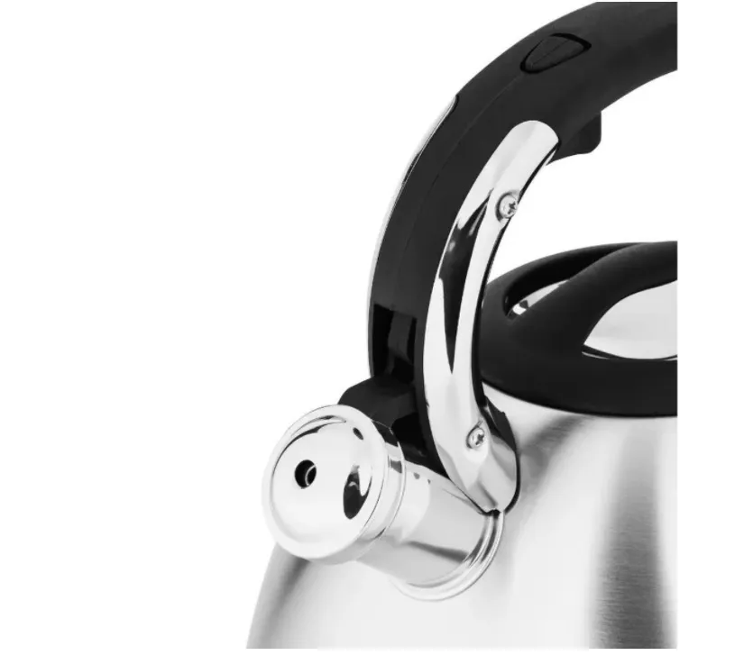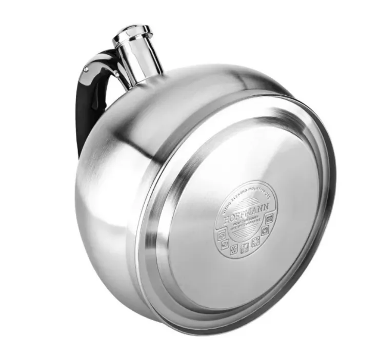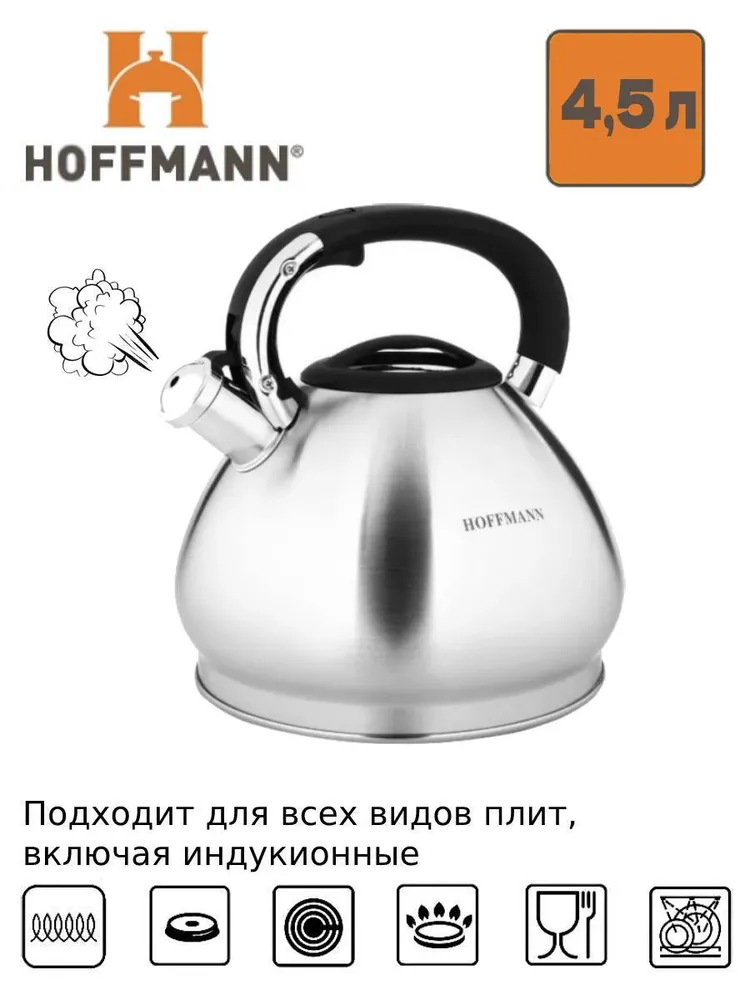 Чайник Hoffmann НМ 55130 4,5 л со свистком. Чайник изготовлен из прочной нержавеющей стали и оснащен бакелитовой ручкой, которая не нагревается во время использования.