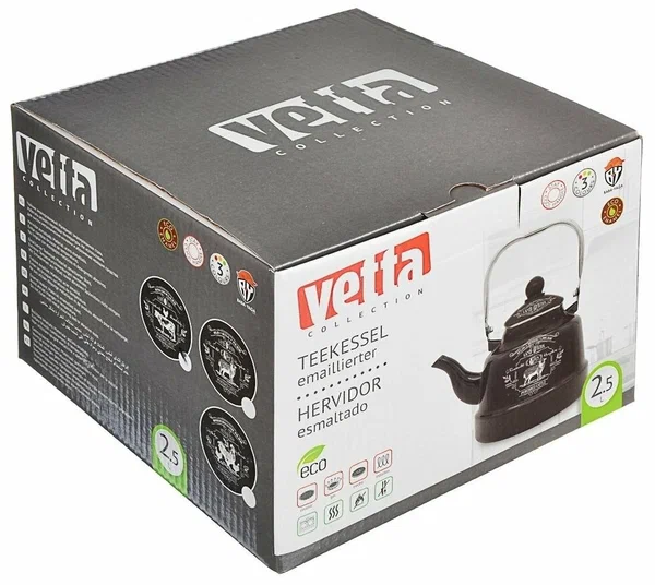 Чайник эмалированный VETTA Ранчо объемом 2,5 л – практичная модель для ежедневного использования. Темный корпус украшен рисунком в стиле кантри, что создаст уютную атмосферу на вашей кухне. Чайник совместим со всеми типами плит, включая индукционные, и удобен в уходе, так как подходит для мытья в посудомоечной машине.