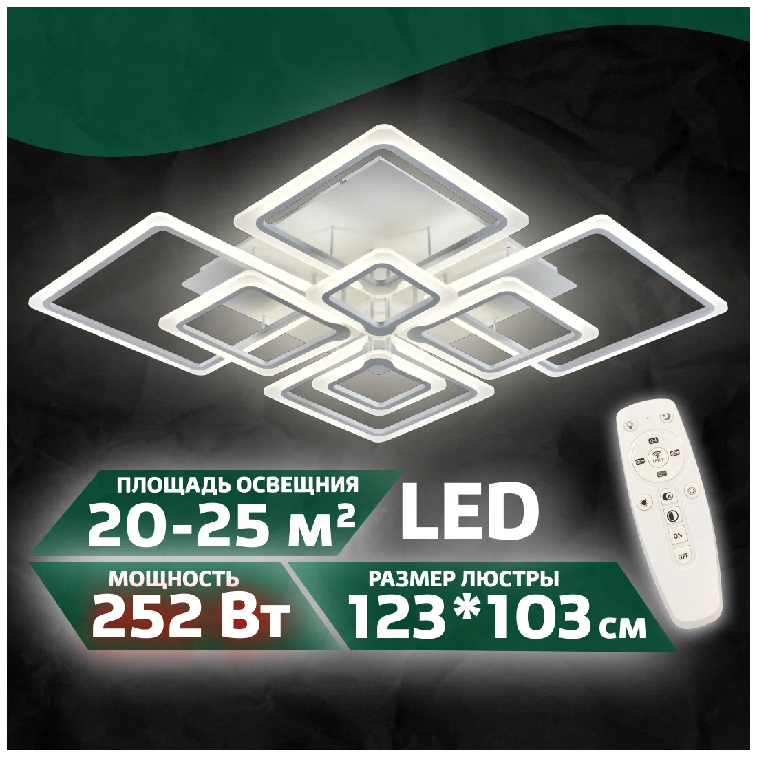 Светодиодная потолочная люстра с пультом 168W . Удобный крепеж размер: 1230х1030х160 мм. Подойдет под все виды потолков: бетон, гипсокартон, натяжные и деревянные потолки. Мощность 168 Вт. Управляется пультом ( батарейка ААА не поставляется в комплекте) и стандартным выключателем. В потолочной люстре установлены качественные светодиоды. Люстра выдает хорошую яркость свечения и равномерное освещение комнаты. Корпус выполнен из металла покрашенной белой матовой краской. Безопасен для зрения, отсутствие ультрафиолетового излучения, отсутствие пульсации. Отличный подарок на новоселье, маме, папе, сыну, дочке, родственникам и друзьям. Люстра подойдет для интерьера детской, гостиной, зала, спальни, прихожей или кухни, загородного дома. Для натяжного потолка, необходима только установленная под полотном платформа из ДСП, фанеры.