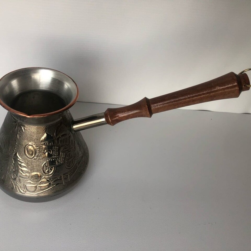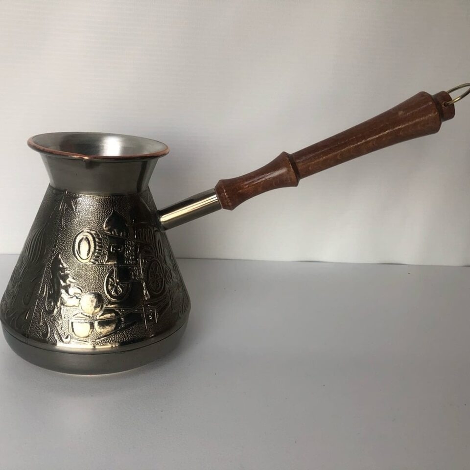 Эта турка имеет узкое горлышко и специальное внутреннее покрытие из пищевого олова, которое предохраняет медь от окисления.