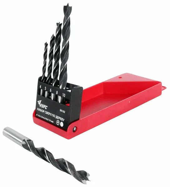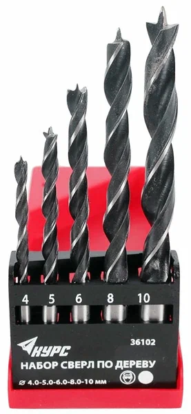 Набор свёрл по дереву КУРС 36102 состоит из 5 шт. с диаметрами 4, 5, 6, 8 и 10 мм.