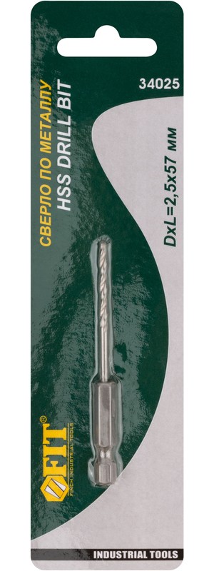 Сверло по металлу HSS с U-образным хвостовиком под биту, диаметр 2,5 мм, артикул 34025 — изделие бренда FIT.
