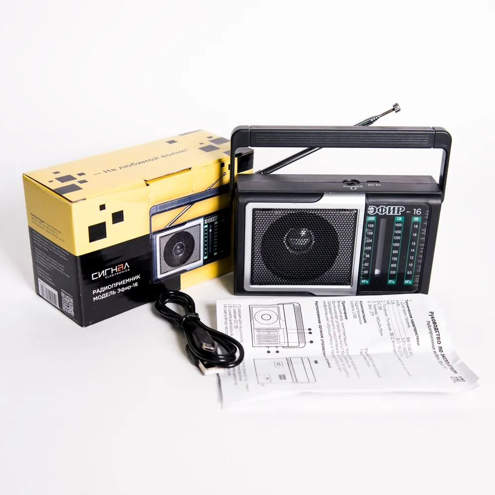Радиоприемник Эфир-16 – это недорогой радиоприемник, который станет прекрасной альтернативой китайскому "no name". Целевая аудитория данного радиоприемника – это дачники, любители природы, городские жители, подойдет как пожилым, так и молодым людям. Корпус выполнен в черном цвете, его масса в упаковке составляет не более 220гр.