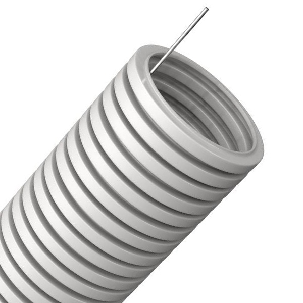 Протяжка в комплекте с трубой гарантирует легкость монтажа и облегчает процесс протяжки проводов внутри трубы. Гофра имеет серый цвет. Кроме того, труба гофрированная может использоваться в различных условиях, в том числе во влажных или сырых помещениях.