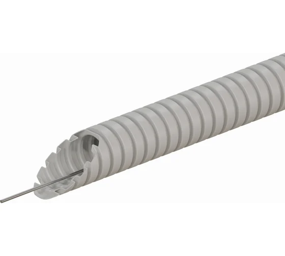 Гофра ПВХ d16мм с зондом серая 20 метров представляет собой легкую гибкую трубу для кабельной проводки в помещениях как по по стенам (и в стенах), так и по потолкам (в потолках).