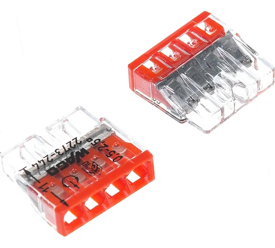 Соединительная клемма для быстрого монтажа WAGO 2273-244 4-х проводная, 0,5-2,5 кв.мм, 450В, 24А, с пастой, предназначена для соединения медных или алюминиевых одножильных проводников.