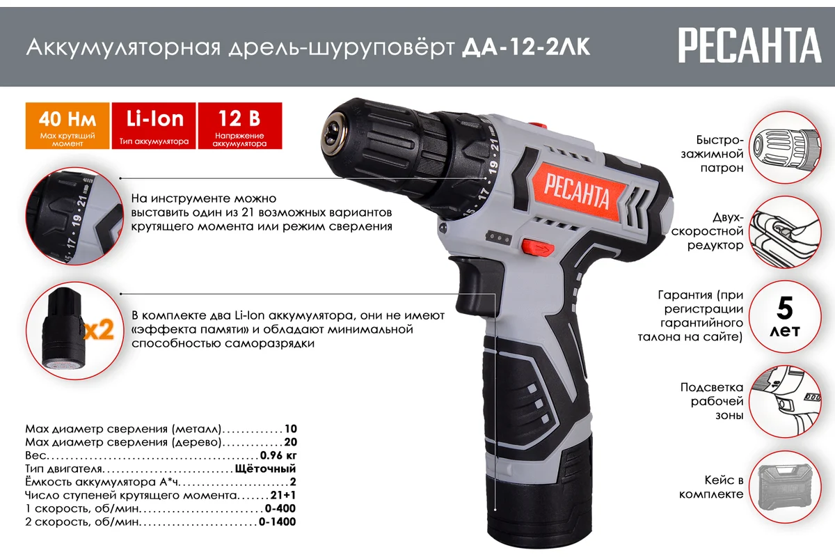 Дрель акк.ДА-12-2ЛК Ресанта
