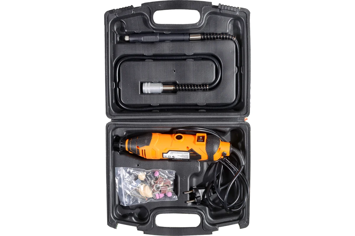 Электрогравер поставляется в пластиковом кейсе, в котором его удобно хранить и перемещать. Кроме самого устройства и гибкого вала в этом кейсе можно найти набор насадок и ключей.