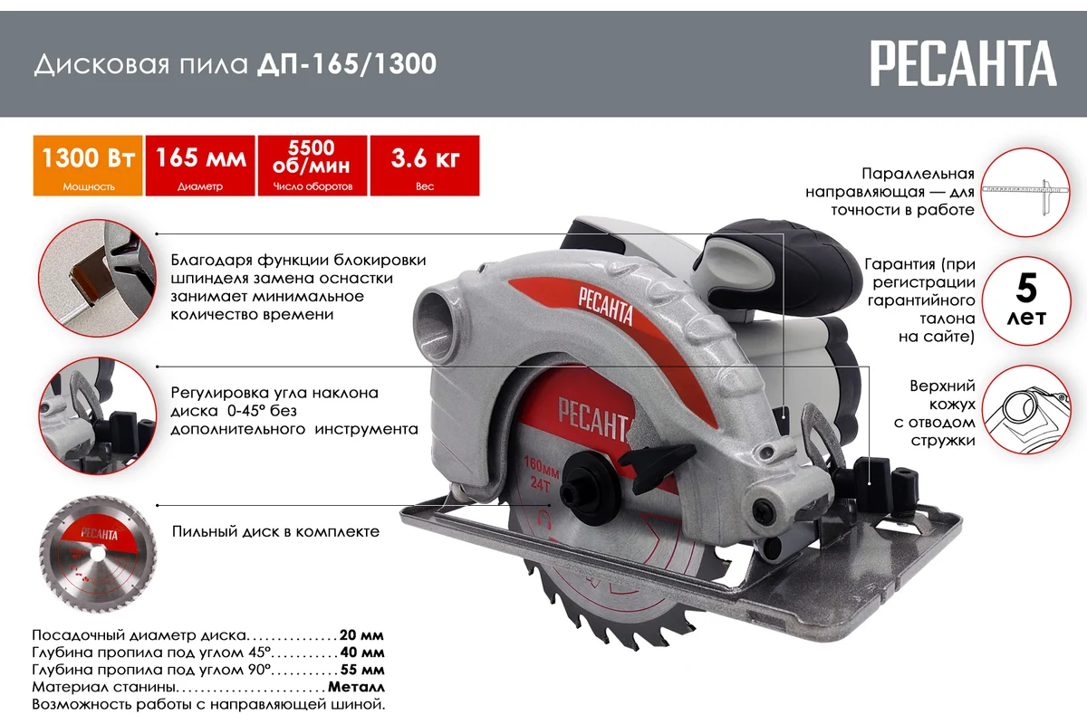 Дисковая пила ДП-165/1300 Ресанта - cредняя по мощности пила, позволяет делать пропил глубиной до 55 мм. Небольшой вес и размер гарантируют удобство при транспортировке.