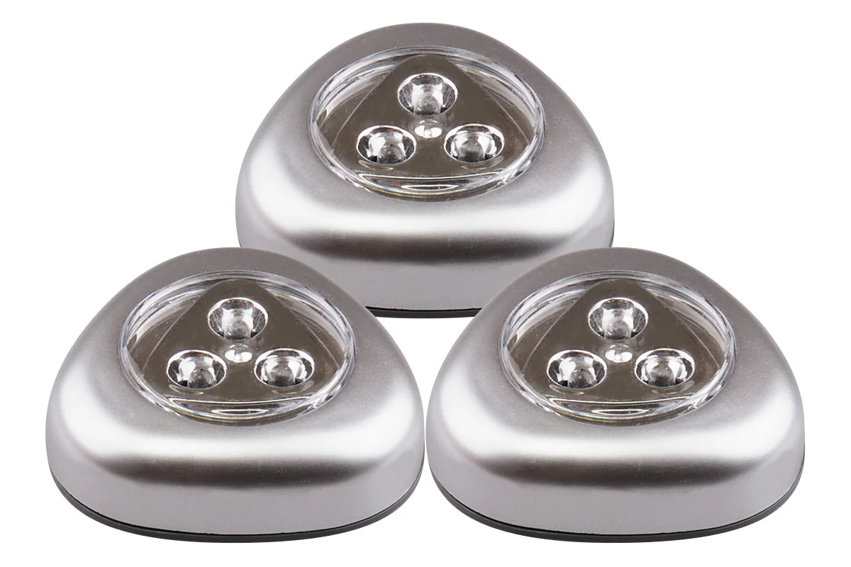 Комплект из 3-х универсальных фонарей- светильников (пушлайт). Идеально подходит для гардеробных, кухонь, стенных шкафов, кладовок, лестничных площадок и других мест, где требуется освещение без прокладки проводов. Включаются нажатием на корпус (пушлайт). 3 светодиода излучают яркий теплый свет. Легко устанавливается на ровную поверхность (двусторонний скотч входит в комплект поставки). Не требует прокладки проводов. Не нагревается . Удобная упаковка по 3 штуки на блистере. Каждый светильник работает от 3-х батареек ААА. Батарейки в комплект не входят.