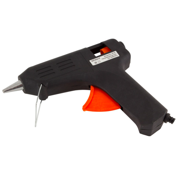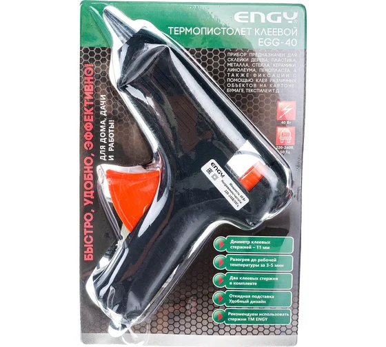 Клеевой пистолет Engy EGG-40 с подставкой, 40 Вт 357116 предназначен для склейки дерева, пластика, металла, стекла, керамики, линолеума, пенопласта, а так же фиксации с помощью клея различных объектов на картоне, бумаге и текстиле и т.д. Может использоваться при работах по герметизации. Для удобного использования имеет откидную подставку для возможности поставить прибор в перерывах между работой.