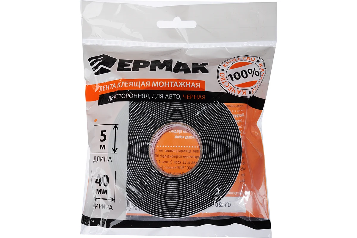 Монтажная 2-х сторонняя клеящая лента ЕРМАК для АВТО, 40 мм x 5 м, черная 472-023 применяется при проведении монтажных, строительных, оформительских работ, а также при ремонте автомобилей.
