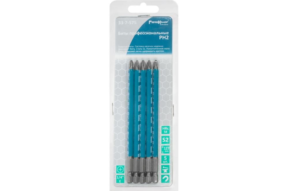 Биты профессиональные (5 шт; PH2x127 мм; сталь S2; 1/4" Е) РемоКолор 33-7-575 предназначены для монтажа/демонтажа крепежных изделий с помощью шуруповертов и отверток. Система насечек надежно фиксирует биту и предотвращает выскальзывание шлица из крепежа. Сталь S2 обеспечивает высокий ресурс работы и защиту от коррозии. Намагниченное жало биты позволяет легко удерживать крепеж.
