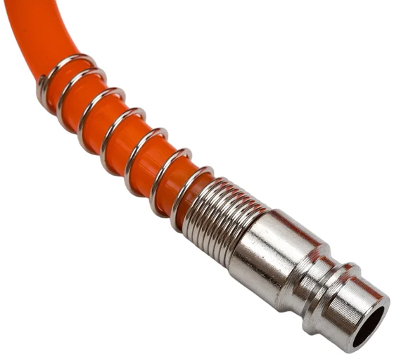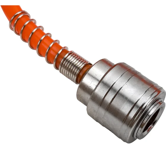Изготовлен из высококачественного полиуретана в форме спирали, легко растягивается в длину и возвращается в первоначальную форму. Устойчив к низким температурам, эластичен, стойкий к истиранию и перекручиванию. Оснащен быстросъемными креплениями, обеспечивающими легкое присоединение и герметичное крепление. Изделие рассчитано на использование при давлении воздуха до 10 бар. Концевые муфты типа рапид изготовлены из качественного сплава, устойчивого к коррозии и деформации.