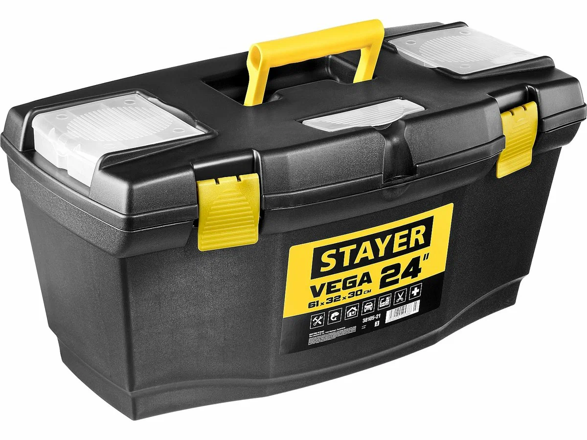 Ящик для инструментов STAYER VEGA-21 (артикул 38105-21_z03) — пластиковый кейс для хранения ручного инструмента, свёрл, бит, буров, расходных материалов и аксессуаров.
