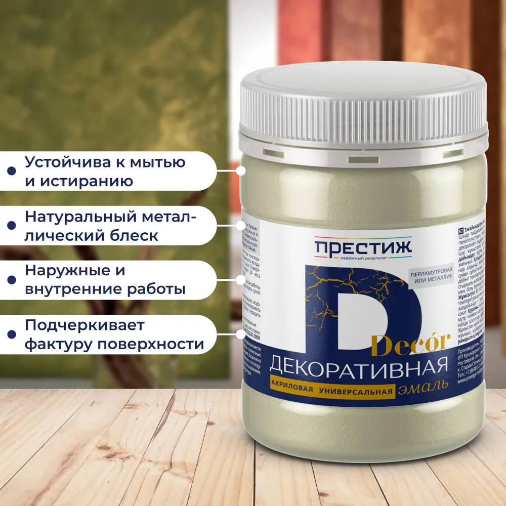 Декоративная обработка различных минеральных и бумажных поверхностей, металла, гипса, пенополистирола. Подчеркивает фактуру и придаёт покрытию декоративный перламутровый или металлический блеск. Для наружных и внутренних работ. Допускается применение в производственных, жилых и общественных зданиях, в том числе больницах, школьных и дошкольных учреждениях, а также для окраски помещений, в которых предусмотрен режим влажной дезинфекции. Универсальная. Легко наносится, быстро сохнет, экологически чистая. Без запаха и растворителей. Стойкая к мытью и истиранию. Образует водо-, свето- и атмосферостойкое покрытие.