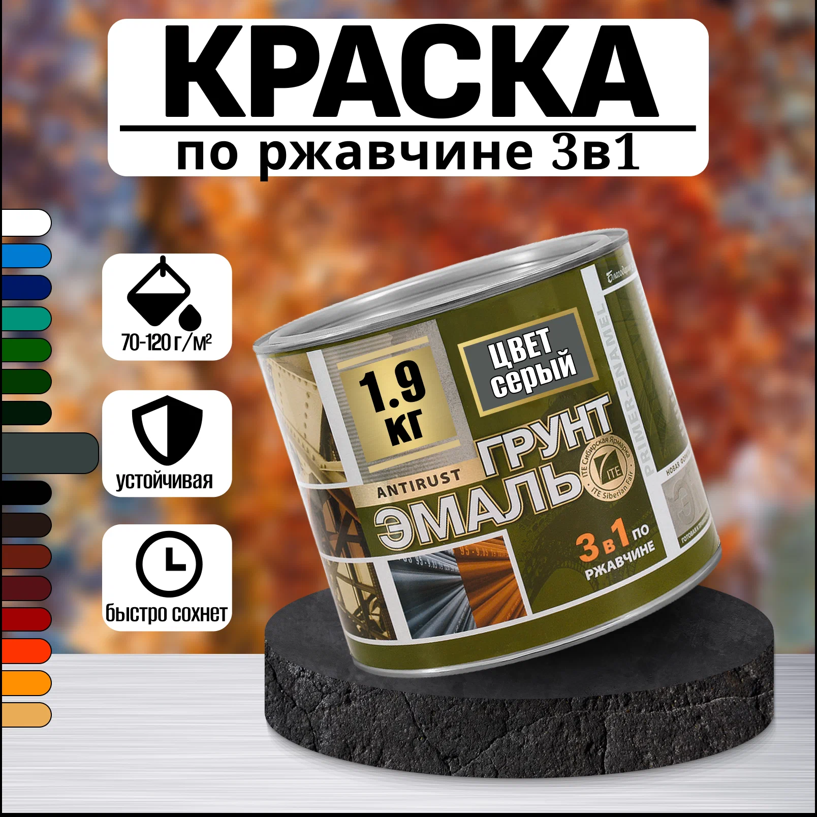 Антикоррозионная и быстросохнущая: Эмаль-грунт обеспечивает отличную укрывистость и атмосферостойкость, а также быстро сохнет, что делает процесс окрашивания более удобным и быстрым.
