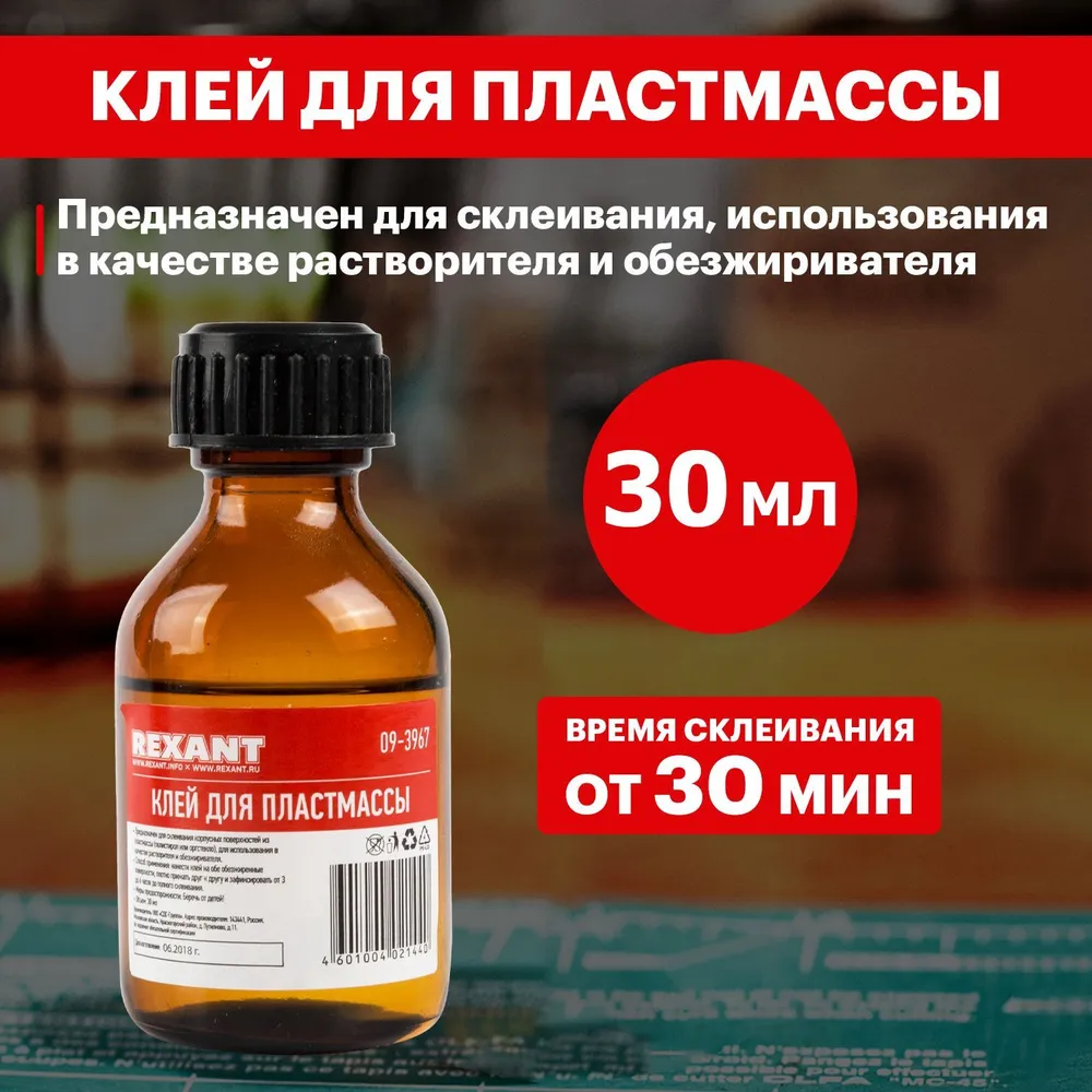 Клей для пластмассы ДХЭ 30 мл REXANT предназначен для склеивания корпусных поверхностей из пластмассы (изделия из оргстекла, полистирола или полиметилметакрилата (ПММА)), для использования в производстве в качестве растворителя (в составе красок, средств для снятия лака, полирующих средств), а также как средство для обезжиривания различных материалов (растворяет жиры, воск, смолы, входит в состав пятновыводителей). Представляет собой бесцветную легковоспламеняющуюся жидкость со сладковатым запахом (похожим на запах хлороформа) и практически не растворяется в воде.