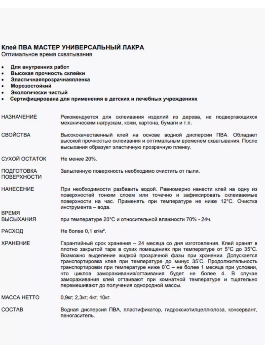 Высококачественный клей на основе водной дисперсии ПВА. Обладает высокой прочностью склеивания и оптимальным временем схватывания. После высыхания образует эластичную прозрачную пленку.