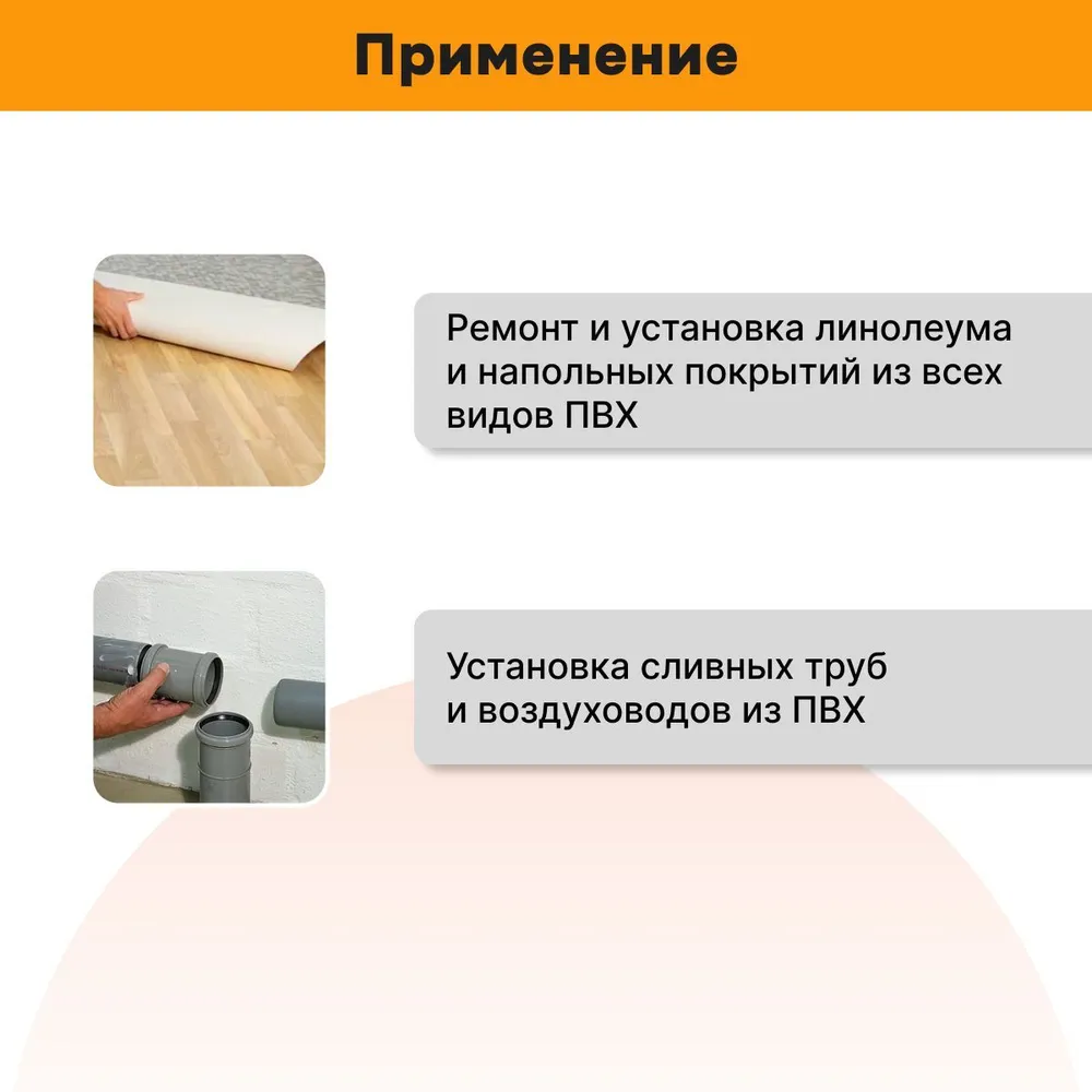 Рекомендуется для склеивания изделий из ПВХ и АБС-пластиков: трубы, хомуты, колена, сливы и стоки