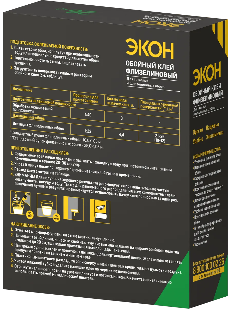 Обойный клей ЭКОН Флизелиновый – это надежное и эффективное решение для наклеивания тяжелых и флизелиновых стенных покрытий. С усиленной формулой и метилцеллюлозой в составе, клей обеспечивает надежное приклеивание и антигрибковое действие. Полупрозрачная, бесцветная и пластичная масса делает его удобным в использовании с чистыми инструментами, такими как кисть или валик.