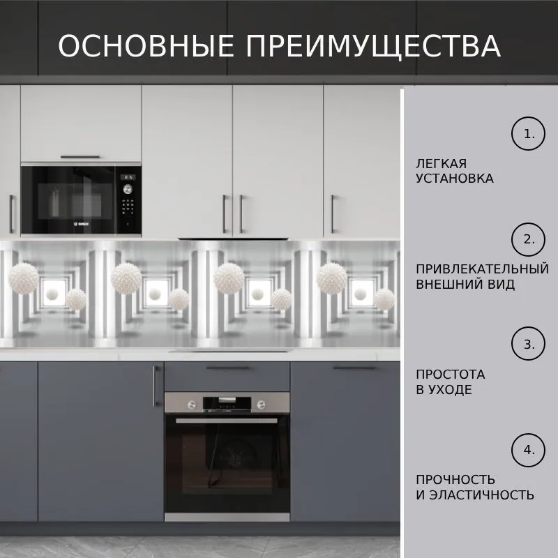 Фартук кухонный – это отделочное покрытие столешницы, плиты, раковины и пространства под верхним гарнитуром, препятствующее загрязнению стен рабочей зоны. Кухонный фартук защищает основную отделку от пара, брызг воды, соков, легко моется, продлевает срок ее эксплуатации и выступает в качестве декоративного акцента интерьера кухни. Рекомендуем ухаживать за панелью с помощью мягкой губки или тряпки с использованием мыльного раствора.