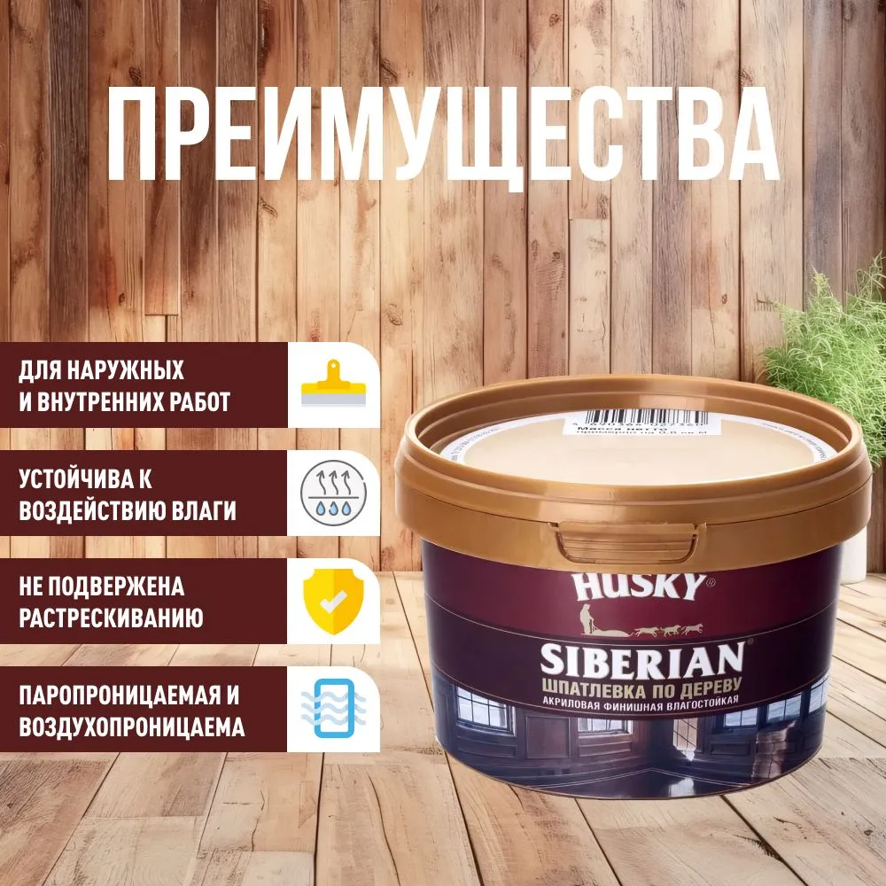 Шпатлевка по дереву HUSKY Siberian. Финишная влагостойкая акриловая шпатлевка по дереву применяется для устранения неровностей и углублений на паркете и других деревянных поверхностях внутри и снаружи помещений.