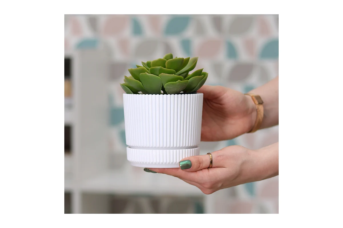 Кашпо состоит из двух частей: корпуса и вставки — используется для сбора лишней воды. У кашпо во вставке предусмотрены небольшие отверстия, благодаря которой лишняя вода испаряется и не застаивается.