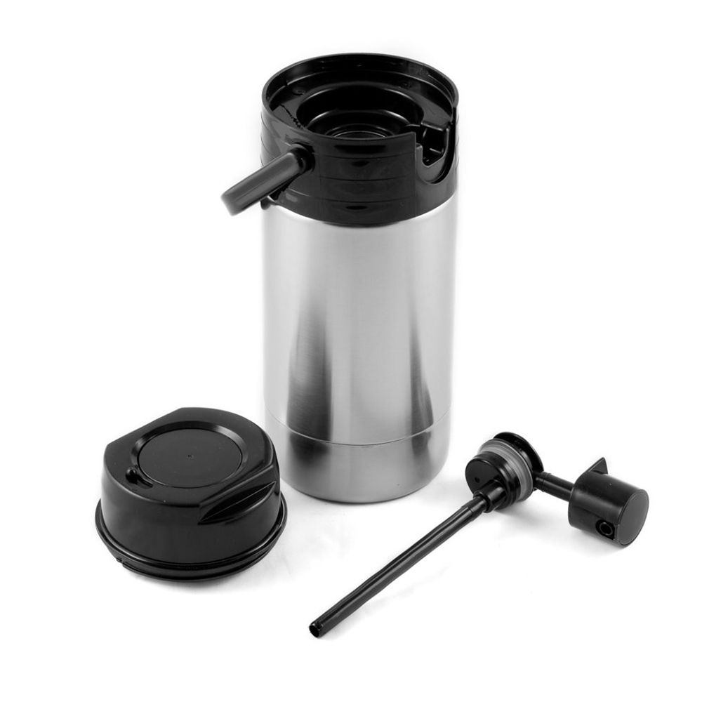 При нажатии на кнопку, в термос нагнетается воздух и создаётся давление. Оно выталкивает жидкость наружу по трубке стопора, установленной внутри термоса. За один ход нажимной кнопки помпы наливается не менее 70 мл содержимого. Кнопка снабжена замком для блокировки случайного нажатия.