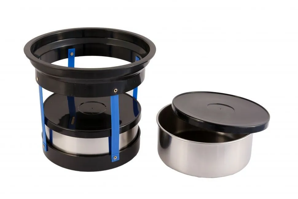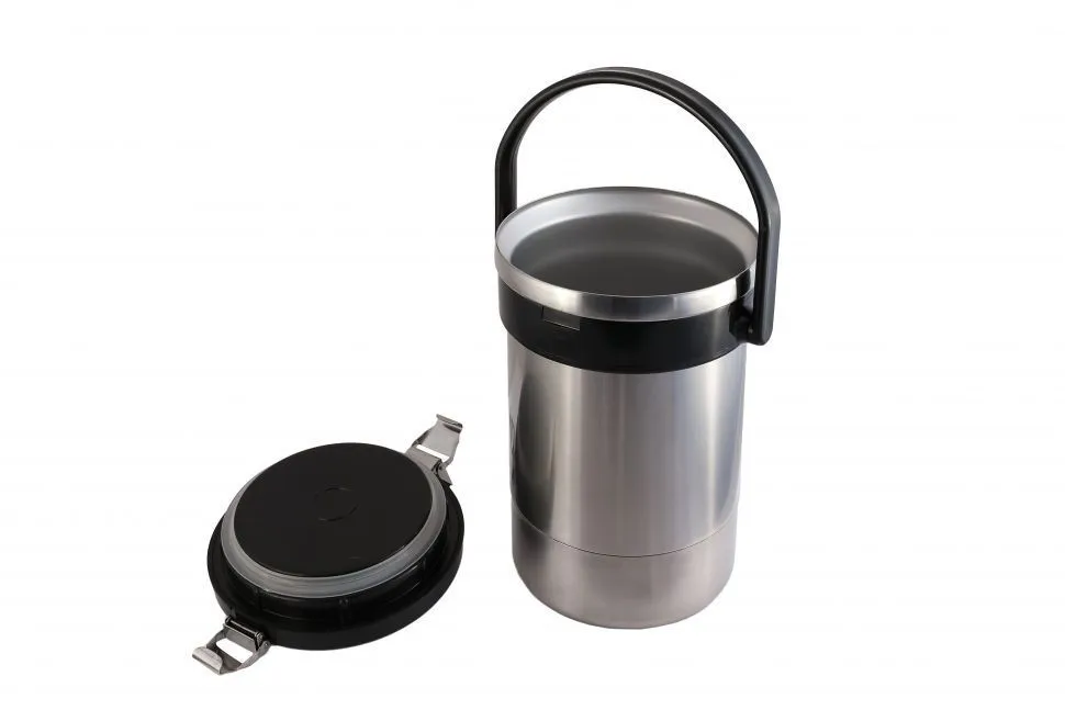 Удобная широкая горловина позволяет легко доставать и погружать контейнеры в двойную металлическую колбу. Крышка термоса имеет два замка для герметичного соединения с ёмкостью.