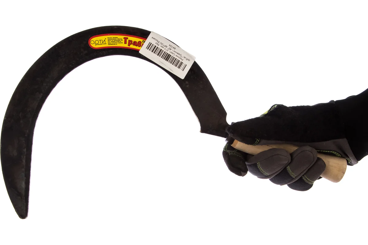 Серп с острым полотном Без бренда «Травник - 45» 64104, ширина захвата 210 мм, используется для срезания травы. Он легко справляется даже с сочными стеблями благодаря остро заточенному рабочему полотну. Полотно отбито и заточено на заводе, поэтому серп полностью готов к эксплуатации.
