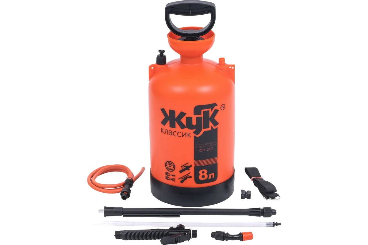 Опрыскиватель Жук ОП-207 8 л применяется на садовом участке или в оранжерее для бережного полива растений или внесения жидких удобрений. Также может применяться для распыления чистящего средства при мытье стен, окон. Вместимость бака - 8 литров. Корпус изготовлен из качественного пластика, устойчивого к агрессивным веществам, содержащимся в удобрениях. Благодаря плечевым рукояткам опрыскивателем удобно пользоваться даже при обработке значительных территорий. Штанга телескопическая (ее длина регулируется от 650 до 970 мм).