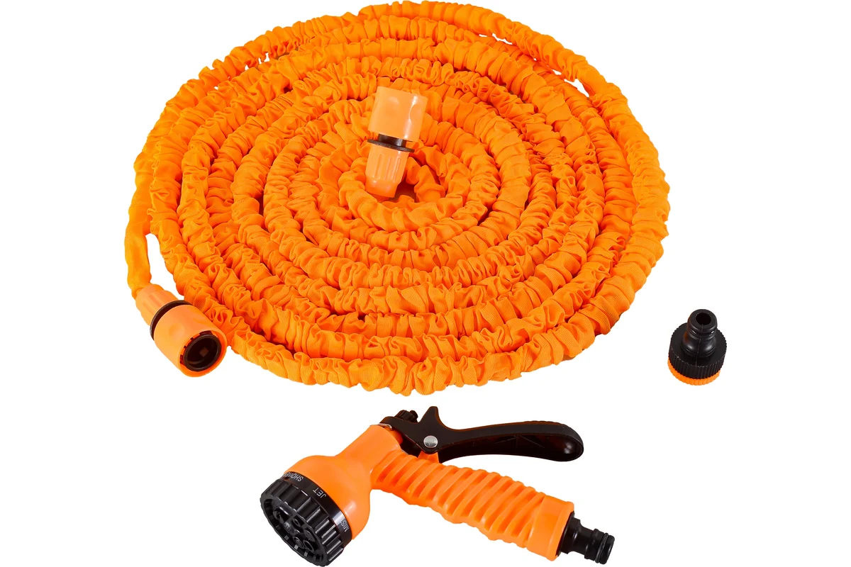 Шланг имеет специальную конструкцию, которая позволяет ему расширяться до 3 раз своей первоначальной длины при подаче воды и сжиматься обратно при ее отключении. Это делает его очень удобным в использовании и позволяет экономить место при хранении.