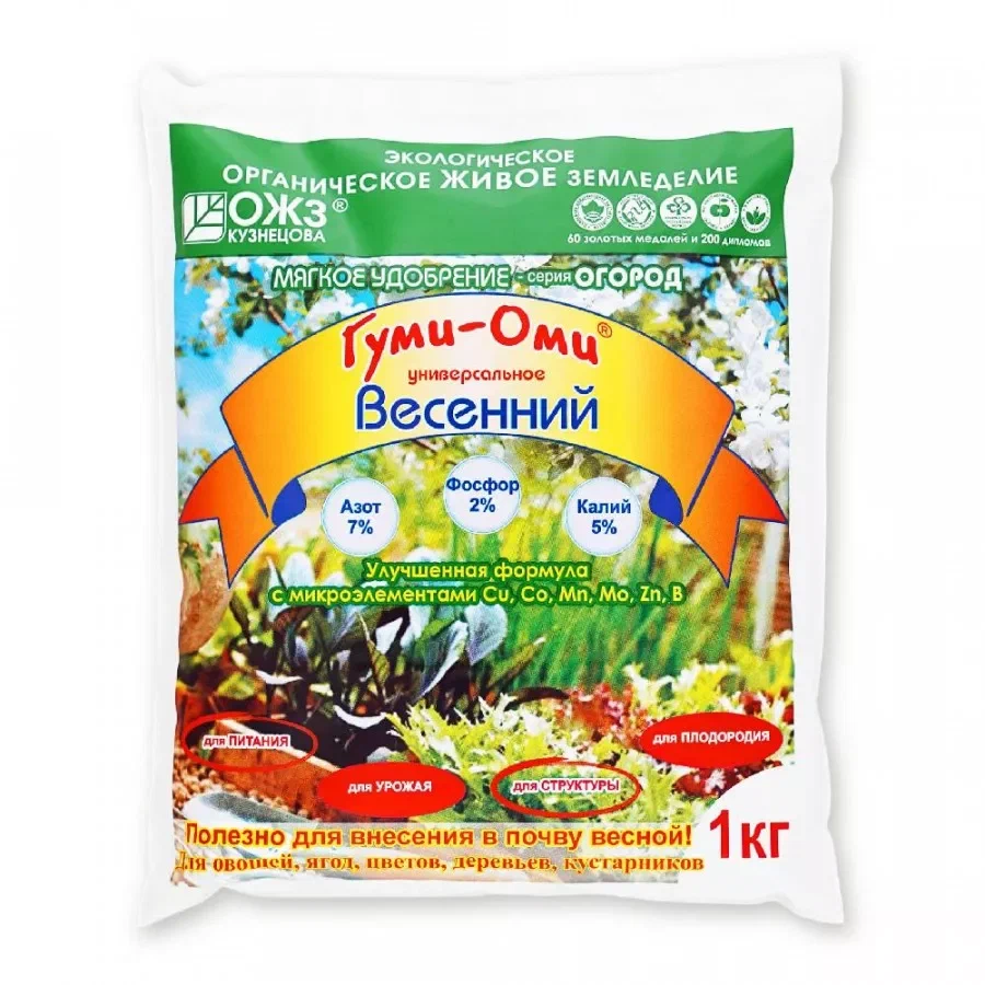 ОЖЗ Гуми-Оми Весенний Универсальный – органоминеральное удобрение с повышенным содержанием азота. Применяется в качестве основного внесения и корневой подкормки для овощных, плодово-ягодных, цветочно-декоративных культур. Препарат способствует активному росту и развитию, гарантирует высокую урожайность, повышает плодородие и улучшает структуру почвы, формирует устойчивость к неблагоприятным факторам окружающей среды.