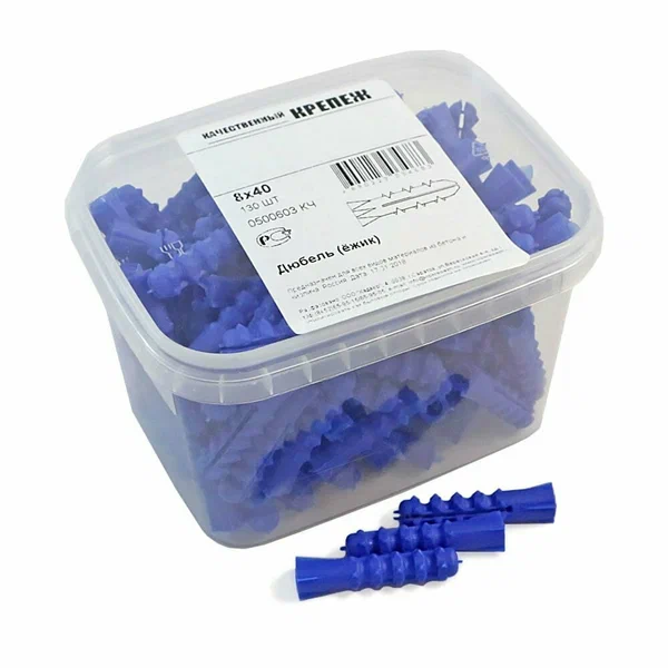 Дюбель пластиковый тип Ёж. Один из наиболее популярных типов распорных дюбелей в России. Отличается большим значением допустимой нагрузки. Расширение дюбеля происходит по всей длине, достигая максимального значения в первой половине дюбеля. За счет этого достигается надежная анкеровка дюбеля. Шипы на поверхности дюбеля усиливают коэффициент трения. Блокировочные ребра на конце дюбеля предотвращают его проворачивание в начальный момент вкручивания шурупа.