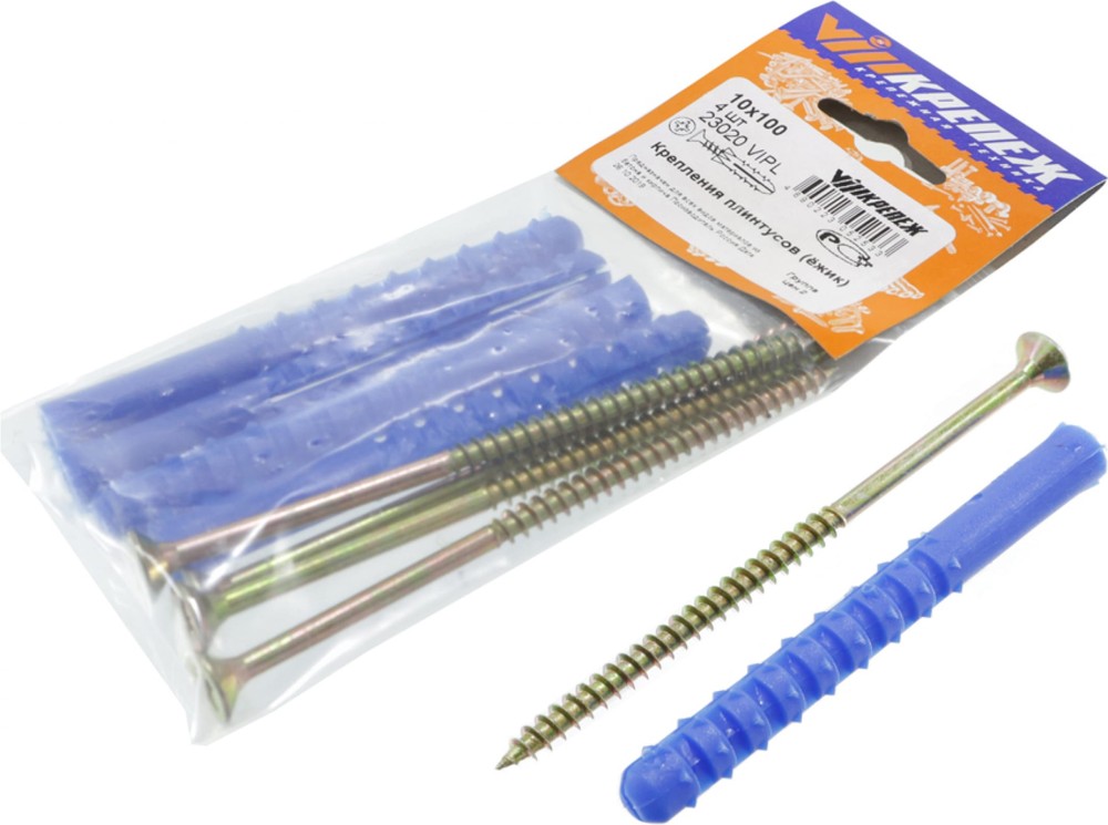 Набор крепления плинтусов VIP — это идеальное решение для надежной и долговечной фиксации плинтусов в вашем интерьере. В комплект входят 4 дюбеля-ёжика и 4 шурупа, что обеспечивает полный набор для установки. Дюбели длиной 100 мм и диаметром 10 мм подходят для крепления как легких, так и более тяжелых плинтусов, обеспечивая надежную фиксацию.