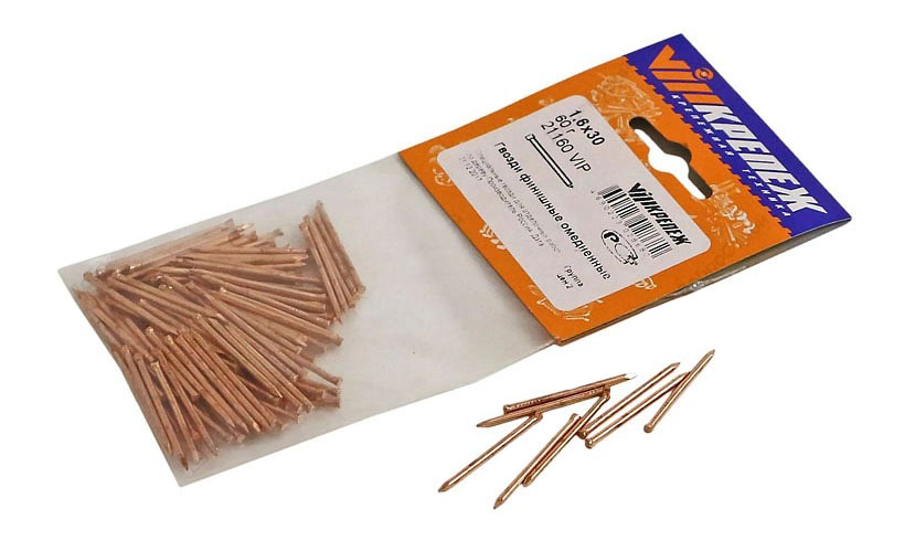 Гвозди финишные омедненные отличаются тонким стержнем и некрупной цилиндрической шляпкой, что делает их практически невидимыми и легко скрывает от глаз место монтажа, обеспечивая потайное крепление. Внешнее покрытие из меди играет и защитную, и декоративную роль. Благодаря медному напылению гвозди предохраняются от коррозии, улучшается сцепка с различными видами металлических оснований.