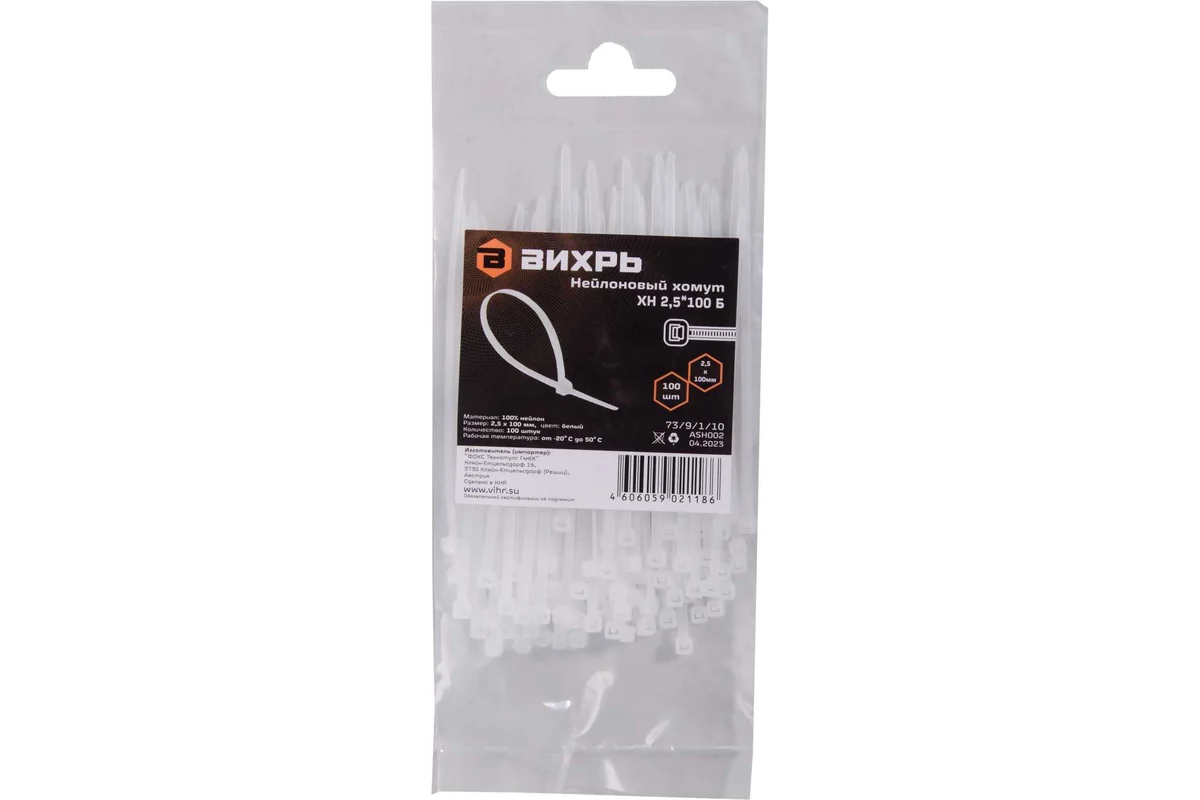 Хомут нейлоновый «Вихрь» (стяжка)2,5*100 Б — соединительный элемент, применяется для крепления и фиксации различных конструкций, систем монтажа, электропроводки и многого другого. Может использоваться при маркировке электромонтажных кабелей, т.к хомут одновременно выполняет функции крепежного изделия и стяжки для электропроводов. Хомуты являются достаточно быстрым и удобным способом крепления и бандажирования, также их можно использовать как в помещении, так и за его границами.