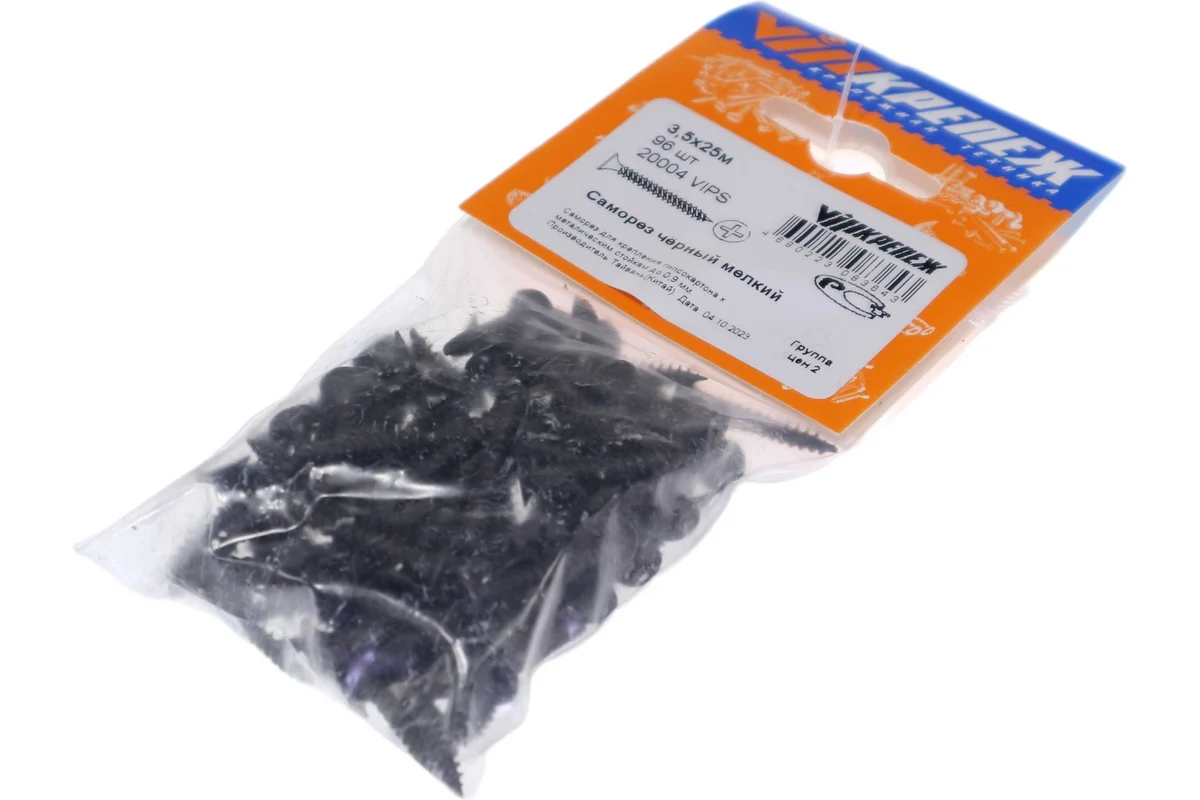 Черный саморез по металлу 3,5х25 мм используется для крепления гипсокартонных плит к металлическим каркасам толщиной до 0,9 мм. Его отличительные особенности: частый шаг резьбы, острый конец, конусная головка и крестовый шлиц. Размеры: Саморез по металлу (черный), мелкая резьба, шлиц PH2. Длина L 25 мм. Длина резьбы по все длине. Диаметр D 3,5 мм.