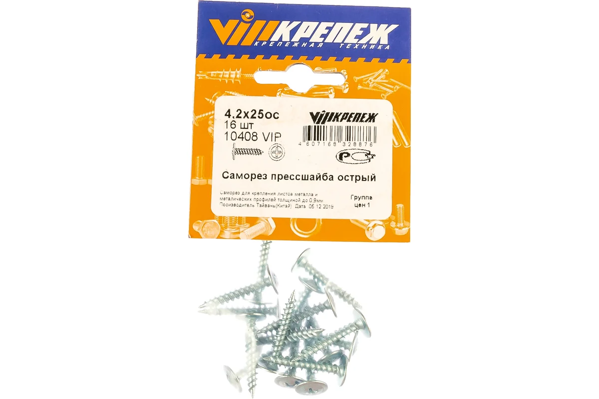 Саморез с прессшайбой VIPКрепеж острый 4,2х25 16 шт 10408 VIP применяется при скреплении различных материалов, например, при монтаже листа металла к основанию. Изделие изготовлено из оцинкованной стали марки Ст 10. Саморез оснащен прессшайбой.