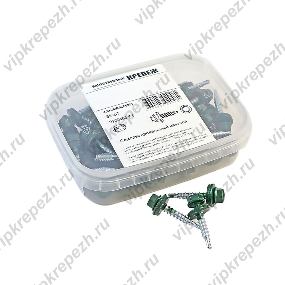 Кровельный саморез «Качественный КРЕПЕЖ» цвета «зелёный мох» (RAL 6005), размер 4,8х29 мм, упаковка 55 шт. (артикул 0200103 КЧ).