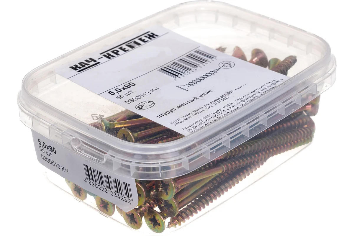 Универсальные шурупы желтого цвета изготовлены из высокопрочной углеродистой стали с последующим цинковым покрытием для защиты от коррозии. Универсальный шуруп предназначен для соединения дерева, ДСП, гипсокартона, тонколистового металла и других материалов. Отличается высоким качеством материалов, имеет крестообразный шлиц PZ, мелкий шаг и низкую резьбу, потайную головку.