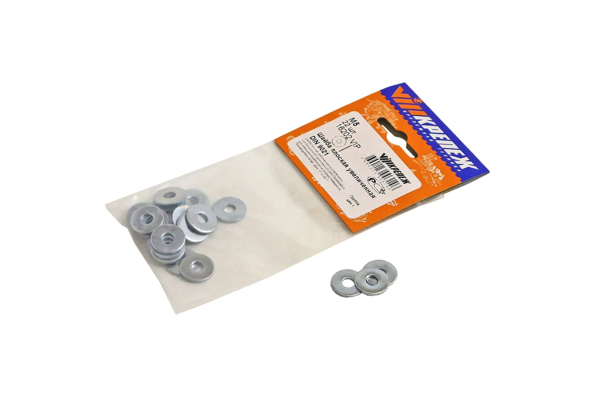 Плоская увеличенная шайба vipкрепеж din 9021, м5, 22 шт. 16202 VIP используется совместно с болтами, винтами и другими крепежными элементами в машиностроении, строительстве. Служит для увеличения прижимной площади соединяемых деталей.