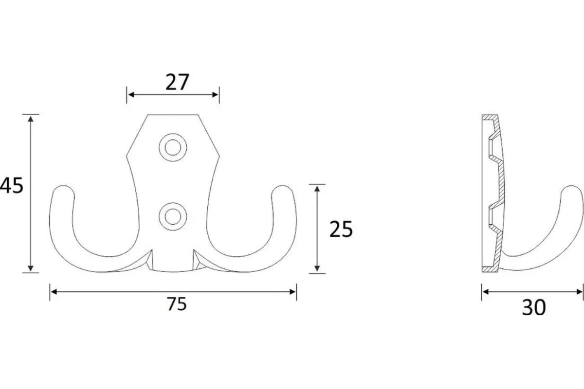 Двухрожковый крючок для мебели, максимальная допустимая нагрузка – 20 кг. Крепление в цвет крючка поставляется в комплекте. Расстояние между установочными отверстиями 18 мм.