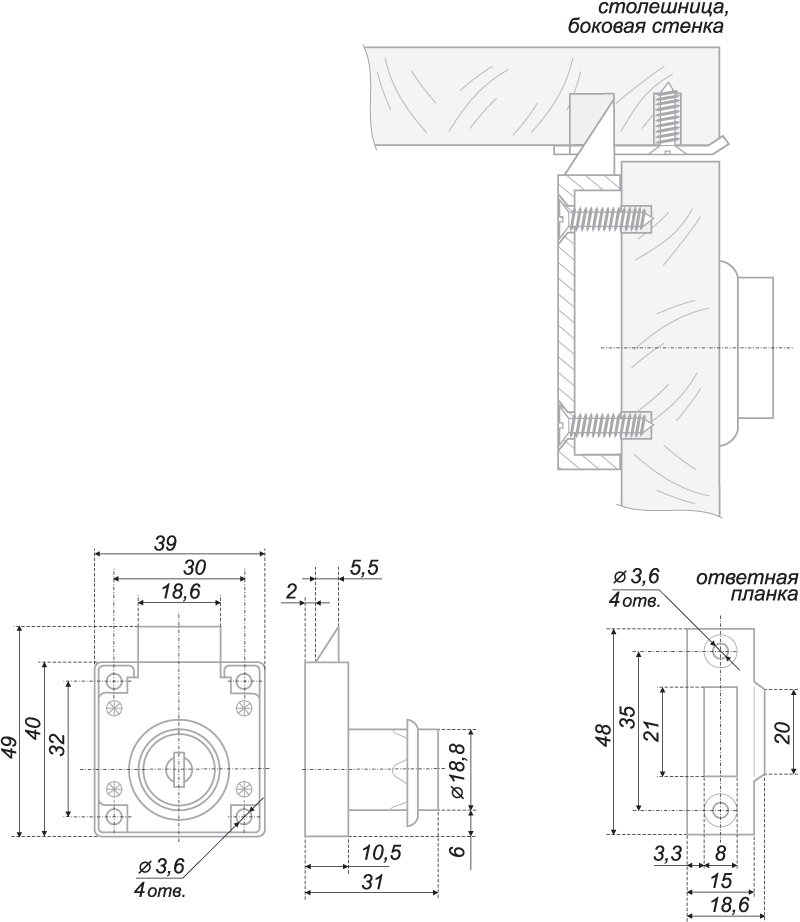 Врезной замок для мебельных ящиков из ЛДСП. Замок с защёлкой. Высота цилиндра: 22 мм. Диаметр цилиндра: 19 мм. Цвет покрытия: Хром полированный. Комплектация: ключ 2шт., ответная планка 1шт., декоративная накладка на цилиндр 1шт.
