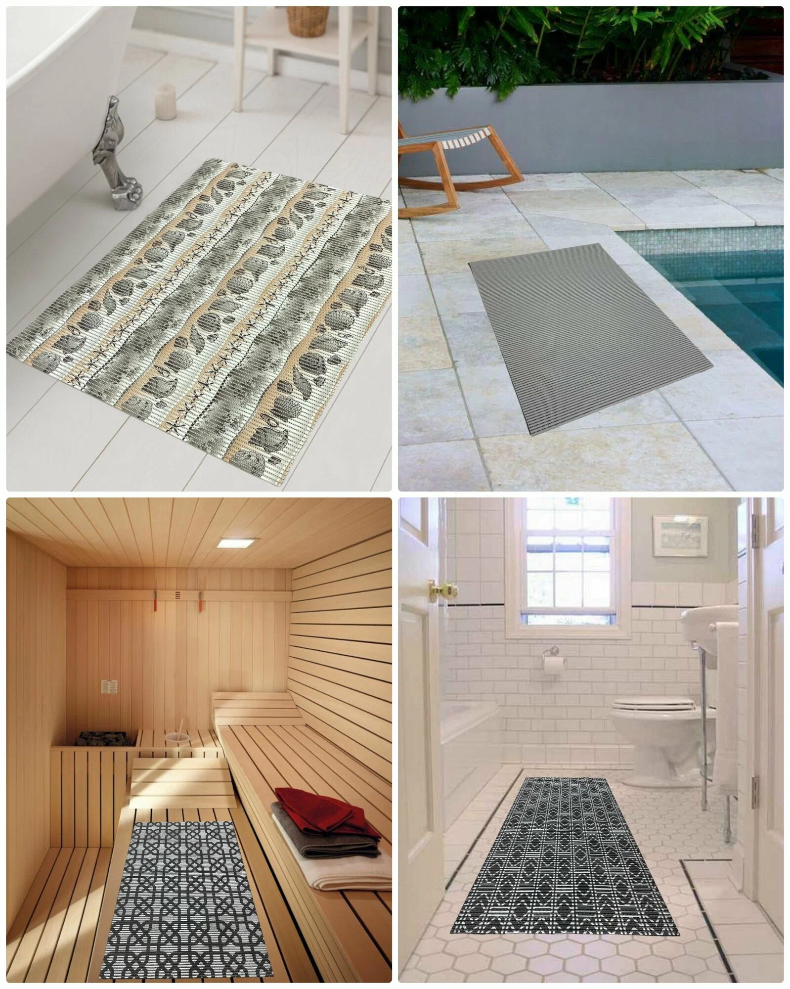 Коврики для ванной из вспененного поливинилхлорида. Они абсолютно гигиеничны, не вызывают аллергию и полностью исключают образование плесени и сырости. Кроме того, такие напольные покрытия просты в использовании, так как легко моются в теплой воде.
