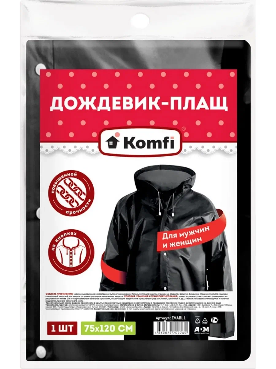 Дождевик плащ на кнопках 75*120см черный с капюшон "Komfi"