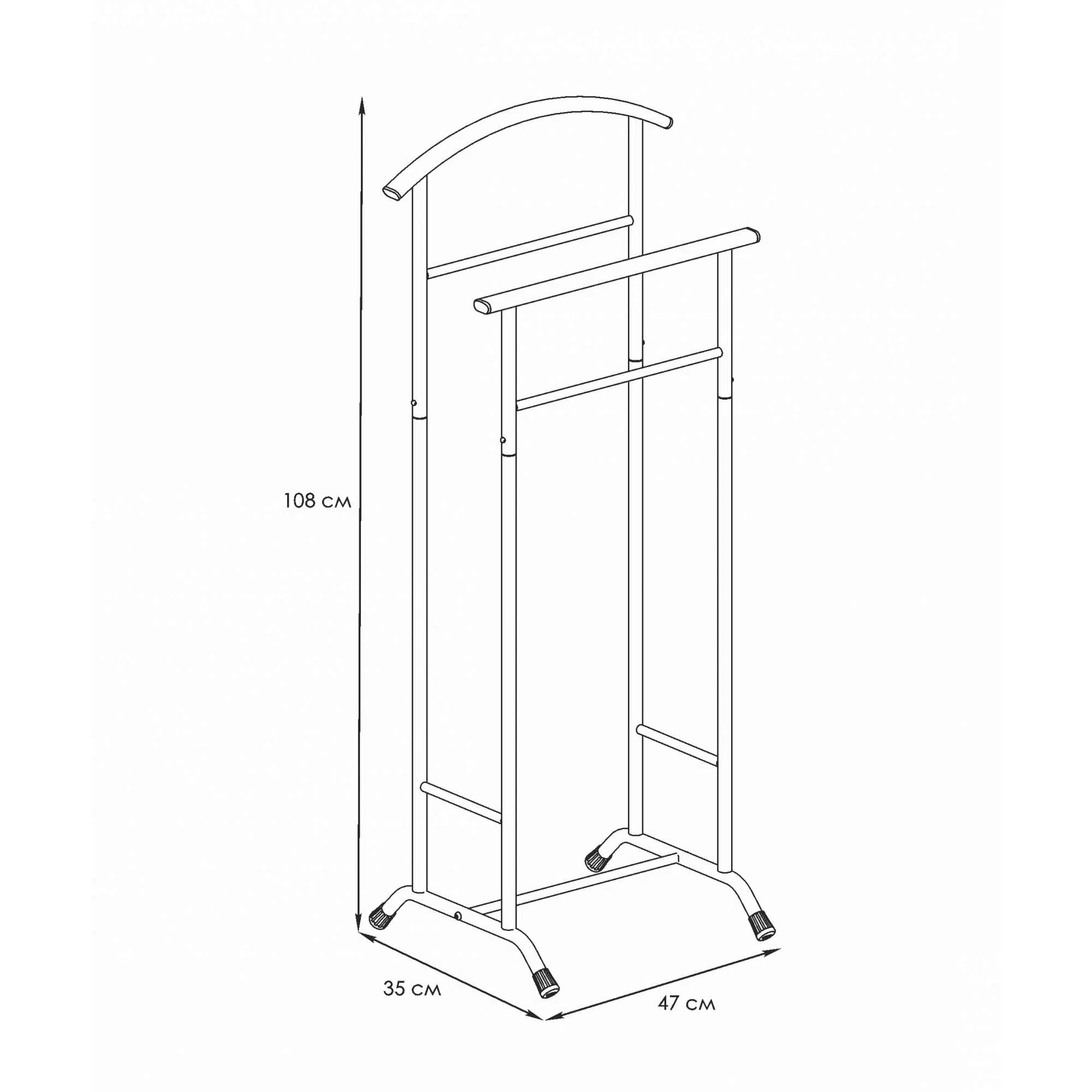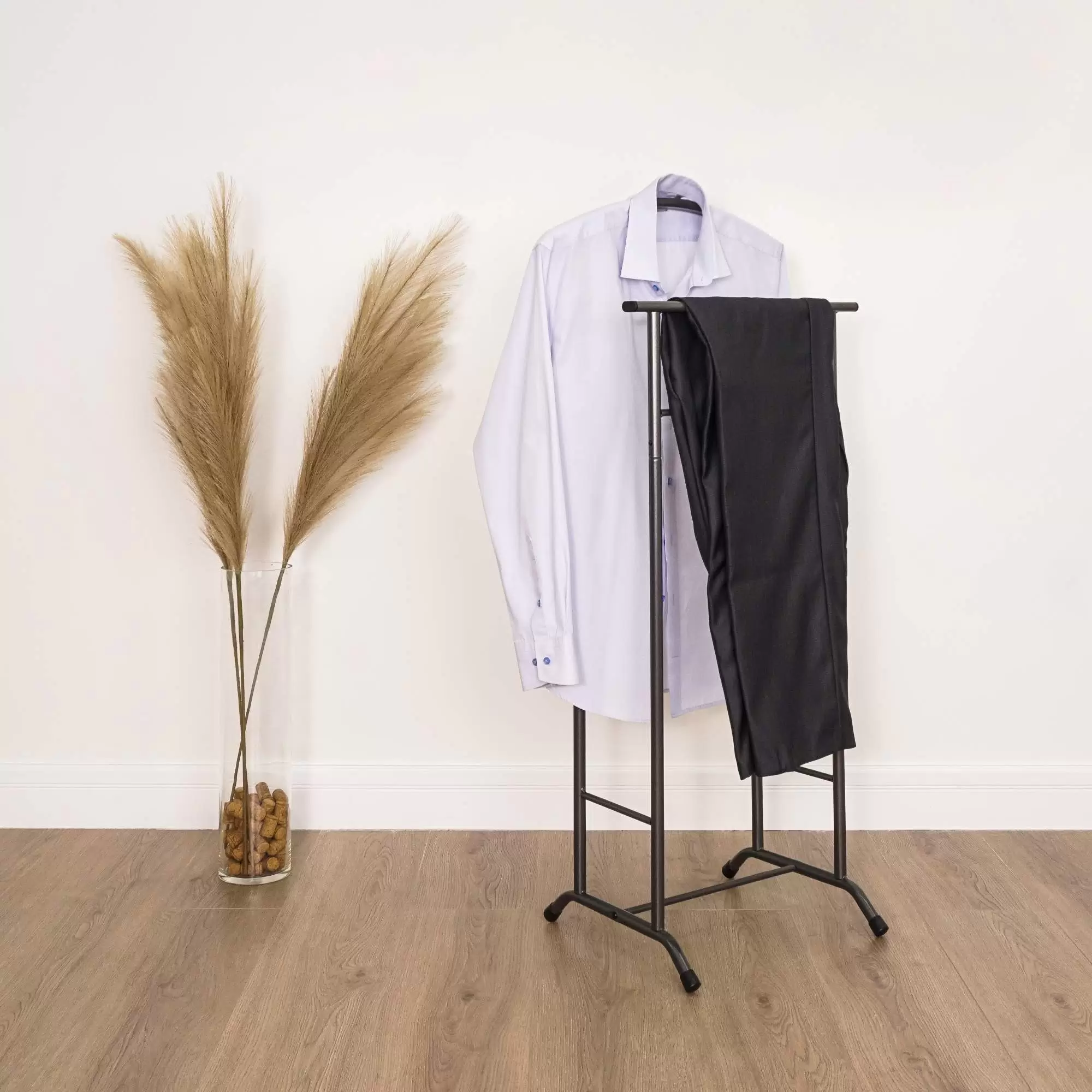 Вешалка имеет компактный размер, что позволяет ее установить даже в небольших помещениях. Она не займет много места, но при этом обеспечит хранение полного комплекта костюма: пиджак, рубашку, брюки и галстук.